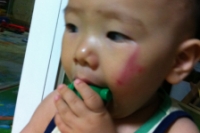며칠 전 일이다. 민지 친구 도훈이가 엄마, 동생과 함께 우리집에 놀러왔다. 민규가 낮잠 잘 시간이 돼 민규를 이모님께 맡기고 나머지 사람들은 모두 놀이터에 놀러나갔다. 한참을 놀고 집에 들어와보니 민규 얼굴이 오른쪽 사진처럼 돼 있는 것 아닌가. "어머! 이모~ 민규 얼굴 왜 이래요?" "세상에... 민규 먹을 죽 끓이고 있었지. 민규는 부엌 서랍 열면서 내 옆에서 놀고 있었고... 그런데 갑자기 퍽 넘어지더니 문 모서리에 찧었지 뭐야." 아... 이번에도 모서리가 문제다. 돌잔치 전날 내 등뒤에서 놀다 밥상 모서리에 찧어 눈두덩이가 찢어졌는데, 이번에는...