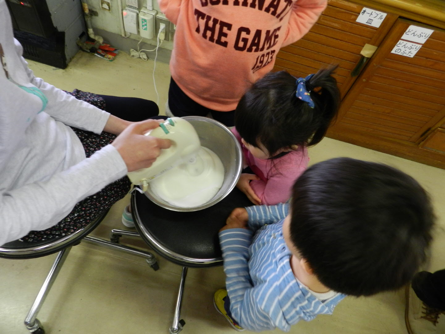 달걀 흰자를 전동거품기로 거품내는데 어린 아이들은