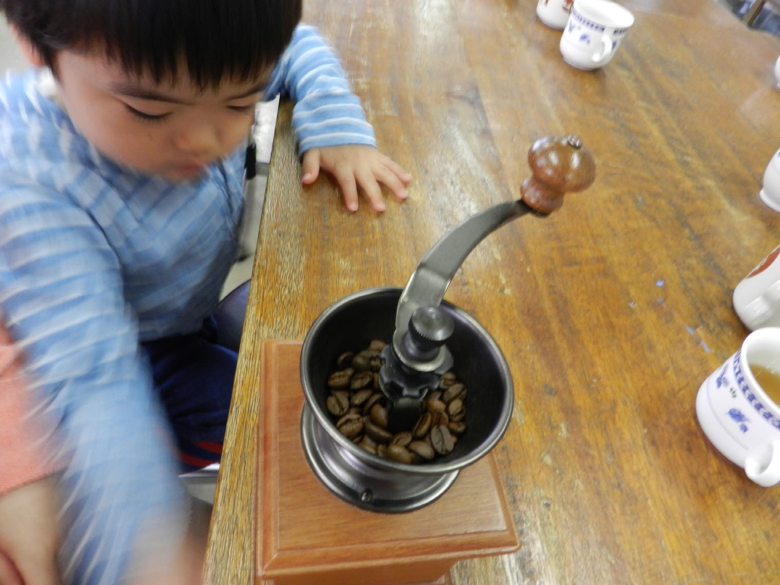 커피광인 엄마가 집에서 가져온 신선한 원두와 분쇄기.