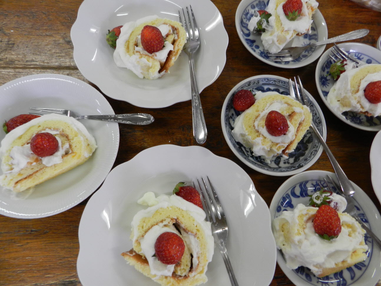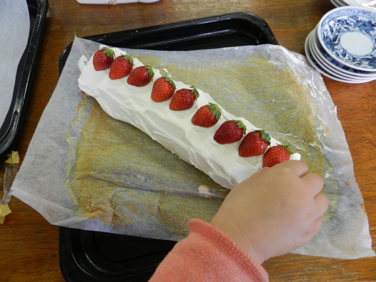 아이들이 반죽해 생크림을 장식하고 인원수만큼 몇 등분해 접시에 담아