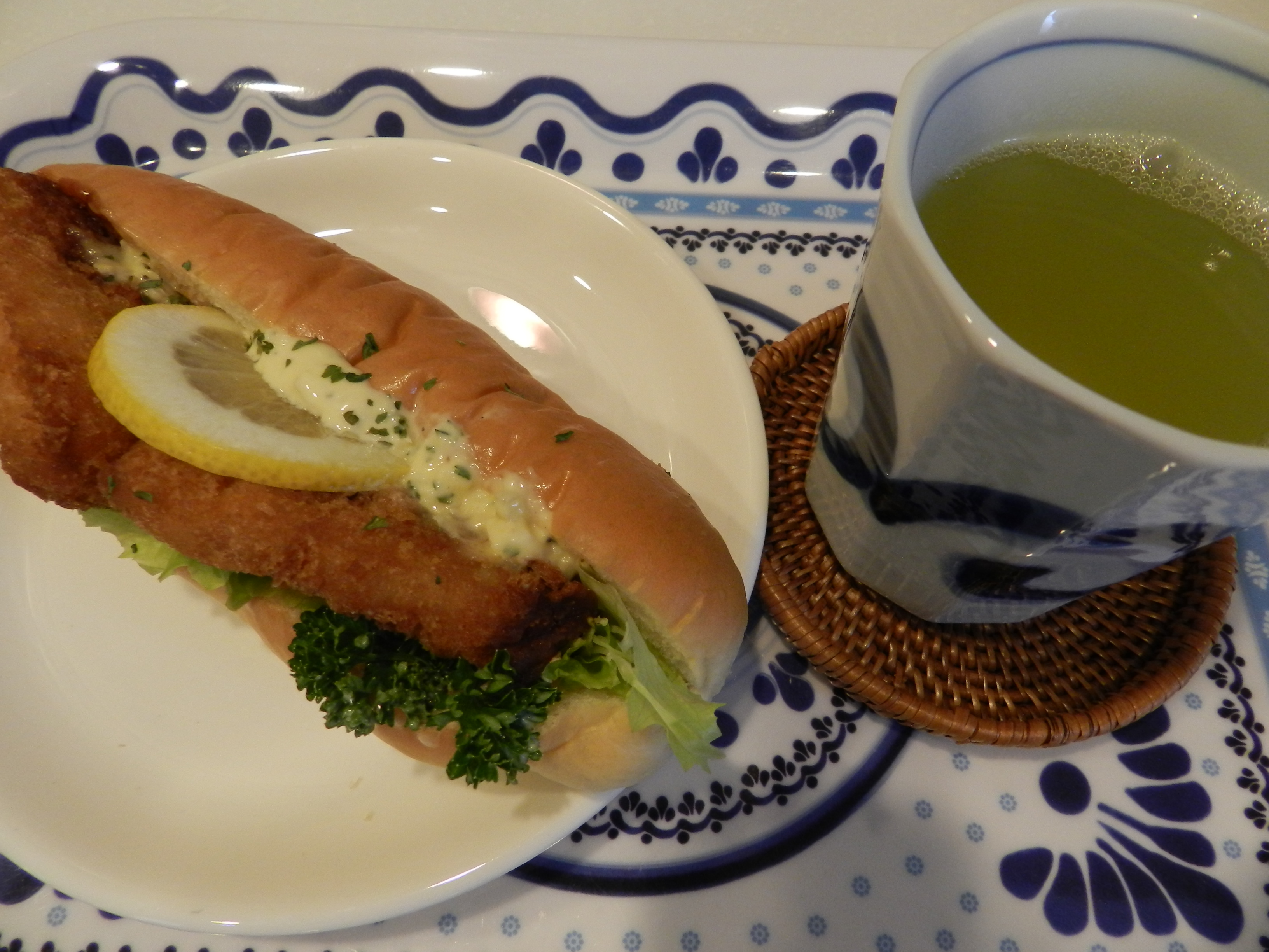 미리 사둔 동네 빵집의 샌드위치와 차로