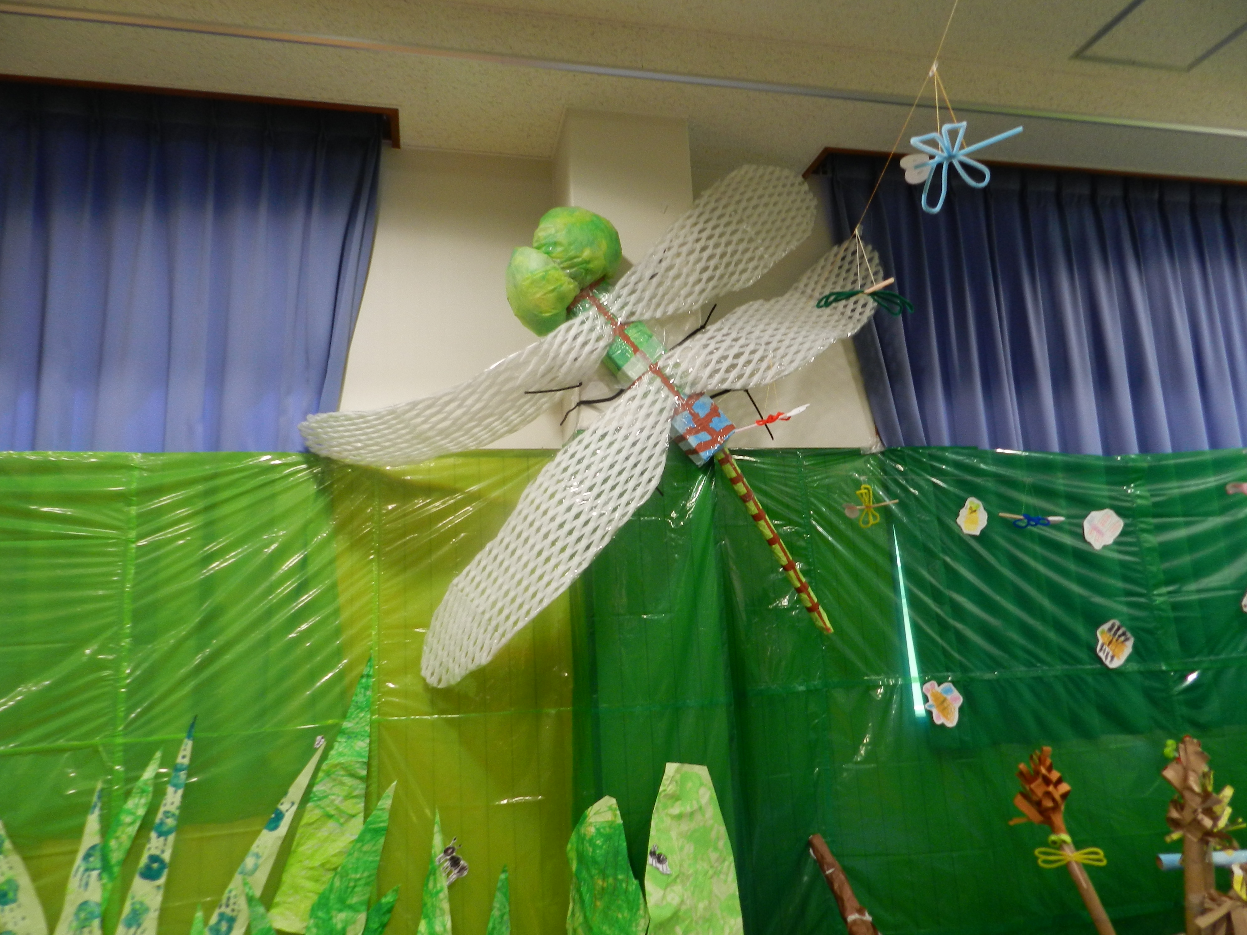 유치원 아이들이 공동작업으로 만든 잠자리인데, 하나하나 뜯어보면 특별한 재료가 별로 없다.