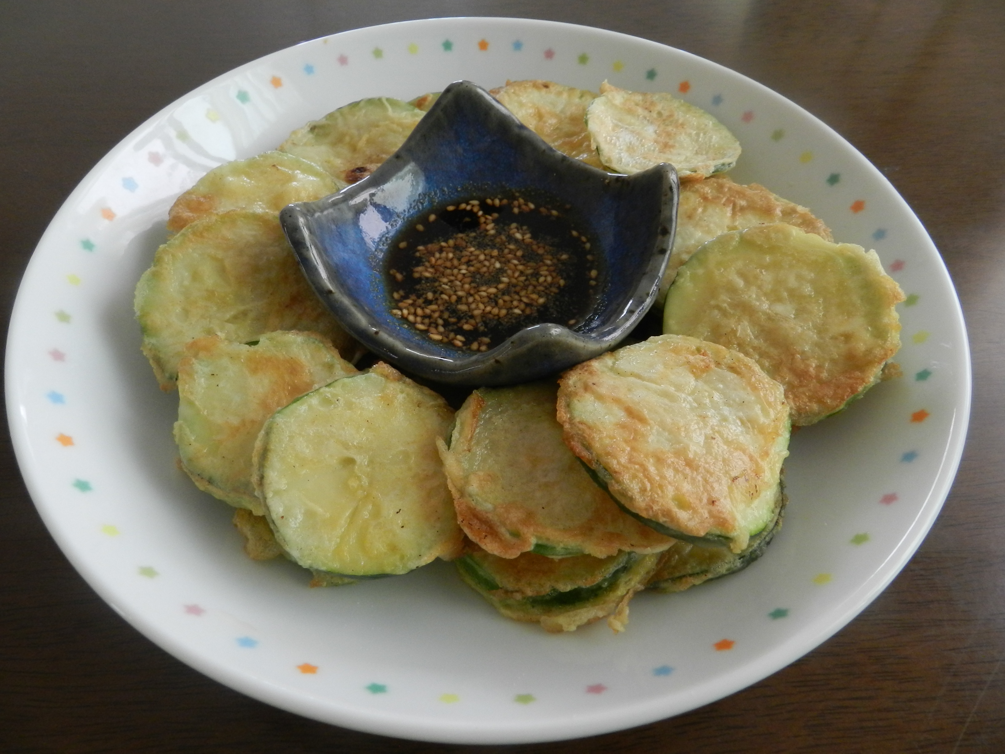 일정한 크기로 애호박을 썰고 - 밀가루와 달걀 옷을 입히고 - 달군 후라이팬에 굽기.