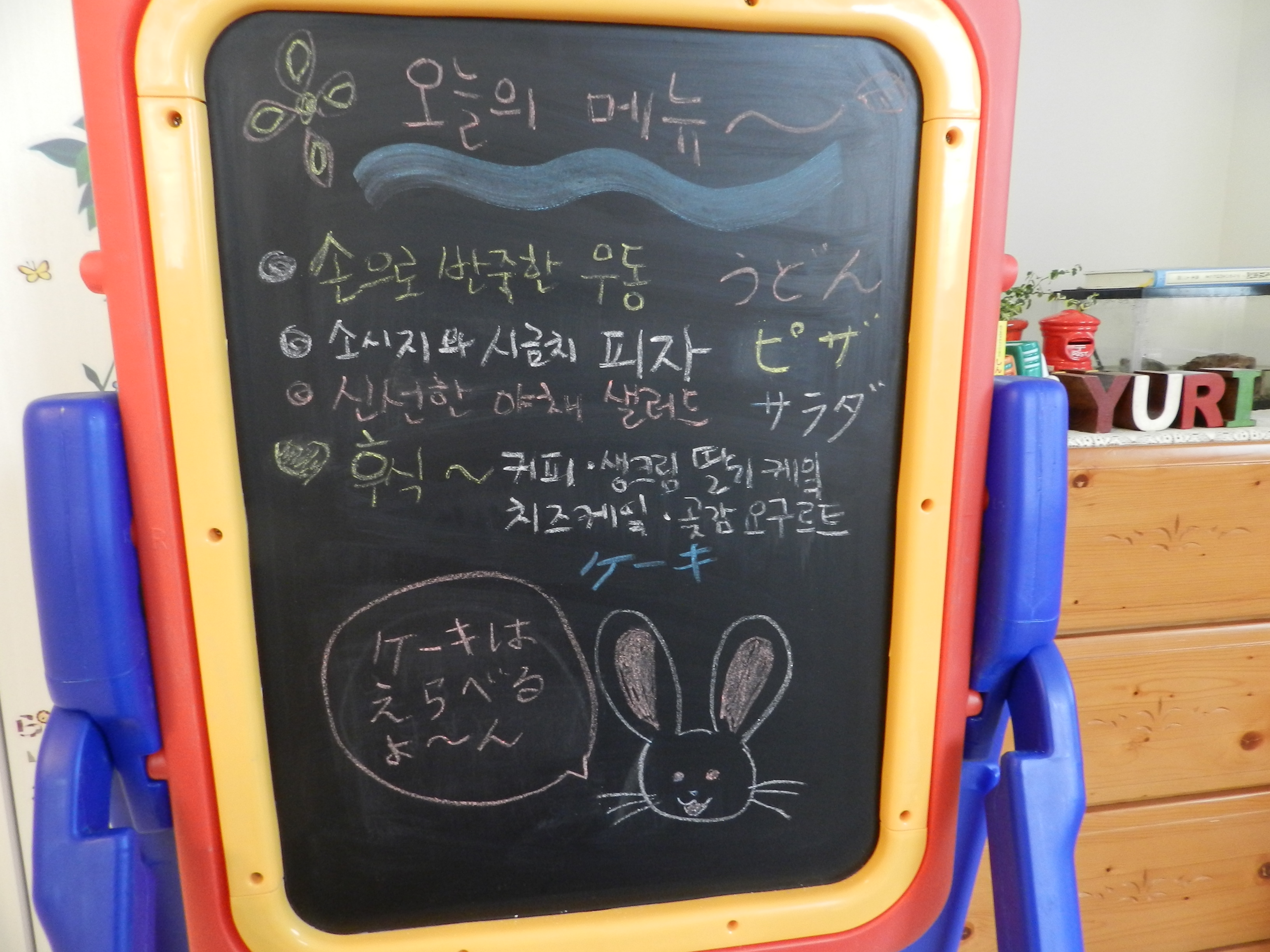 이미 손님맞이 준비에 익숙한 큰아이는 장난감 칠판에 나와 함께 메뉴를 쓰고, 그림을 그렸다.