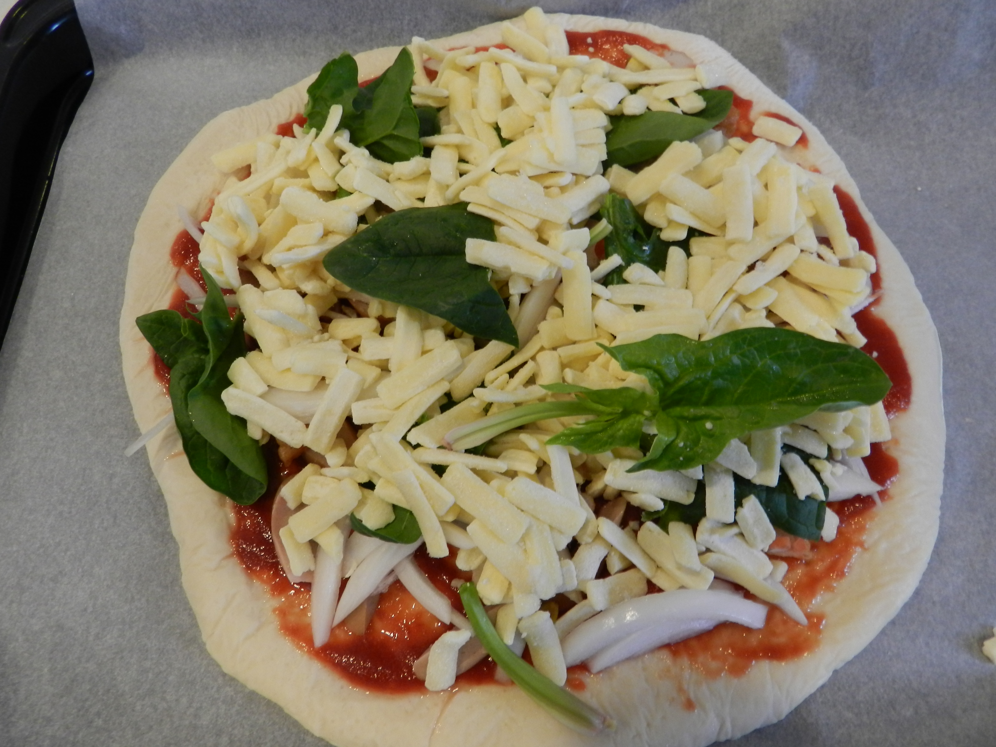 역시 냉동해둔 피자 반죽에 소스, 소시지, 햇양파, 시금치와 치즈를 듬뿍 얻어 오븐에 굽고