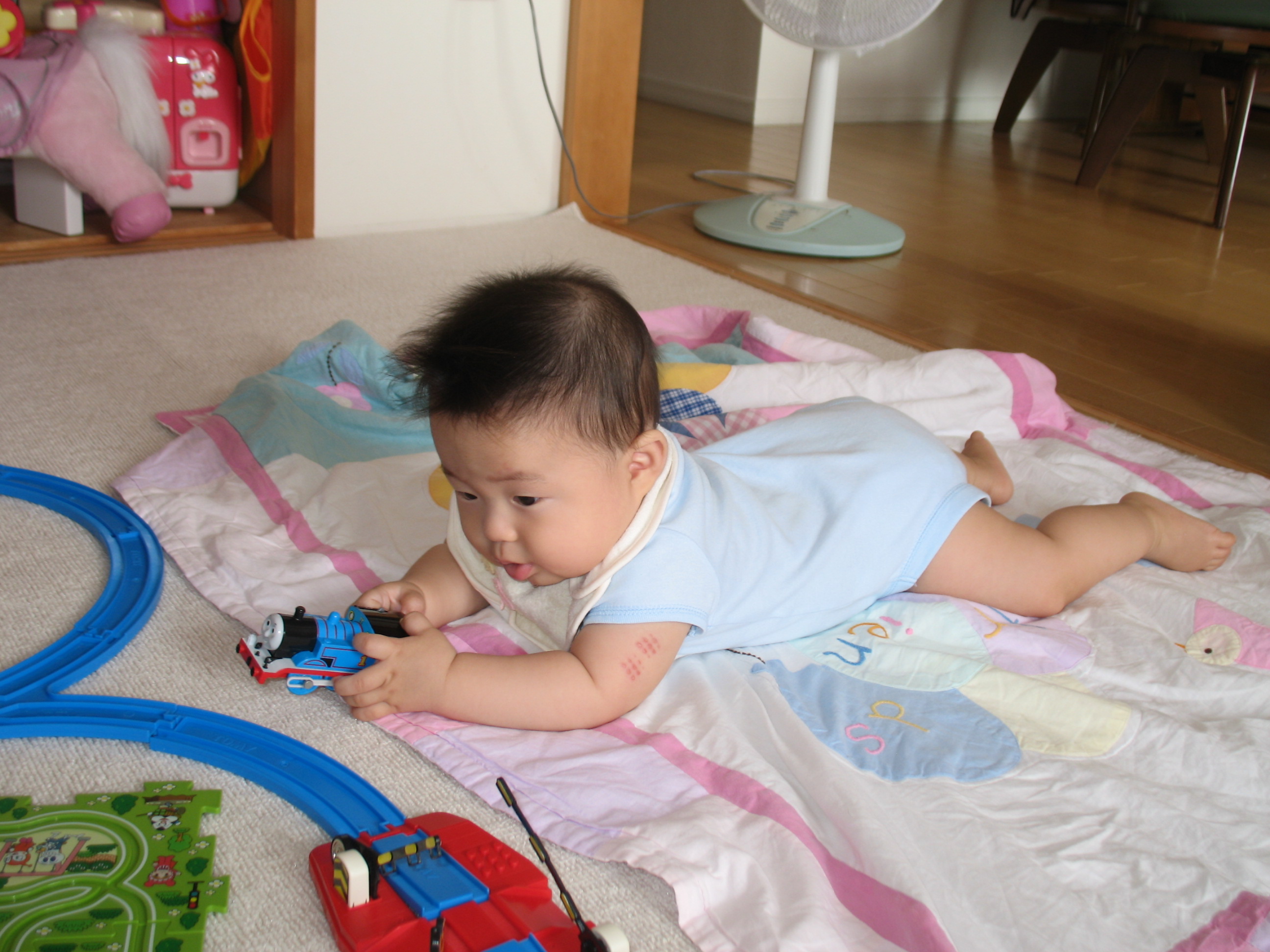 혼자 힘으로 앉지도 못하던 그때부터 업드린 채 토마스 기차 모형을 만지거나