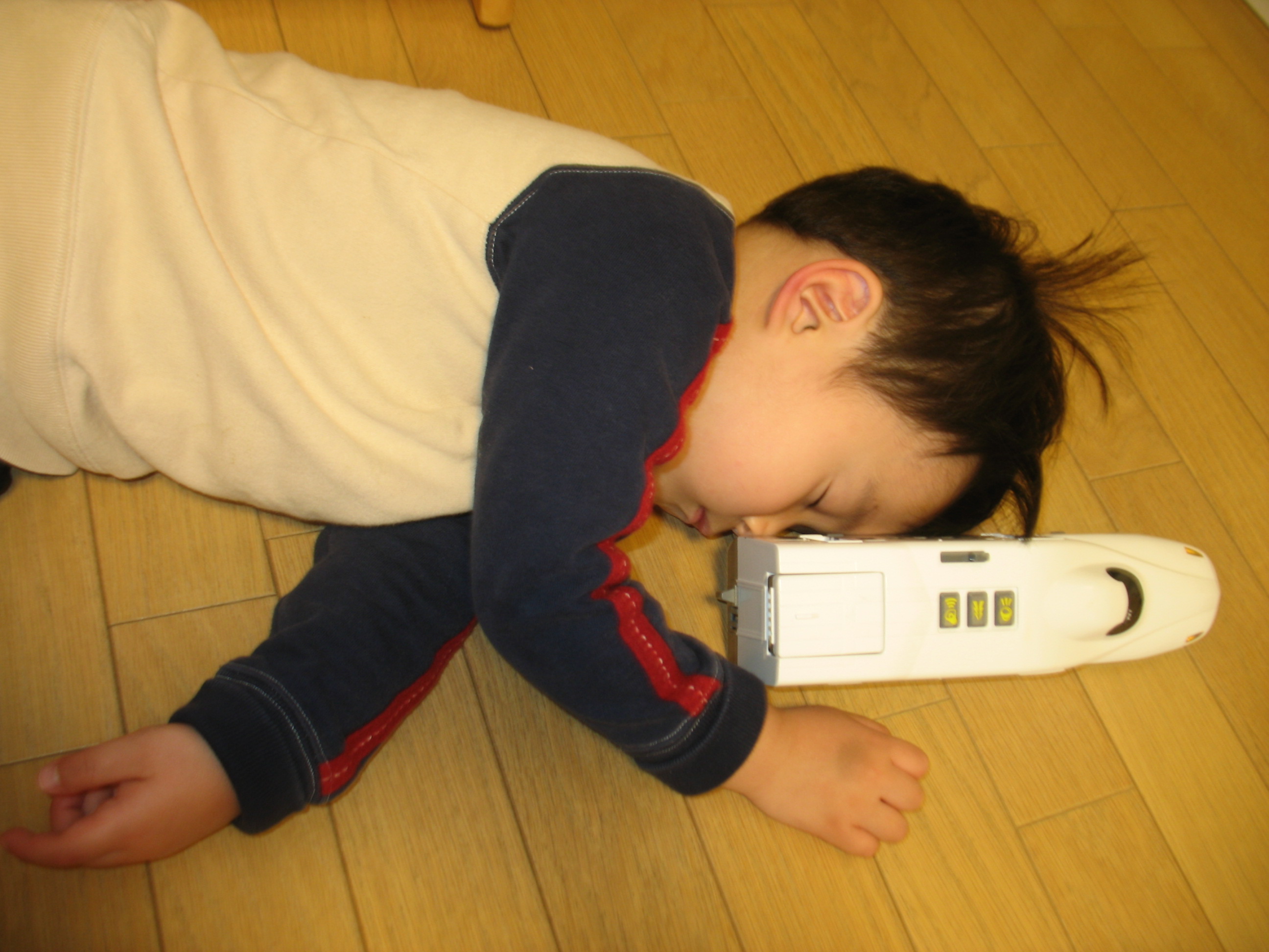 옆으로 엎드려 기차 장난감을 앞뒤로 밀면서 놀다가 잠드는 일이 많았다.