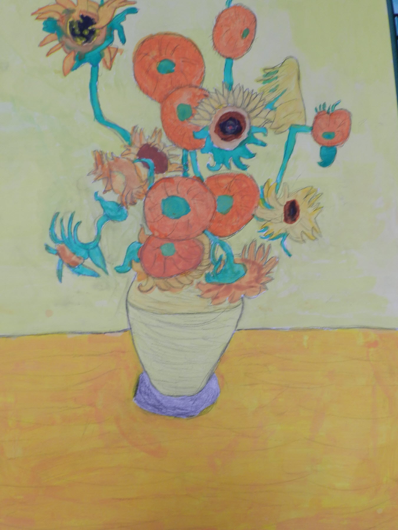 <명작 패러디> 그림이다. 고흐의 '해바라기'를 보고 따라 그린 그림인데